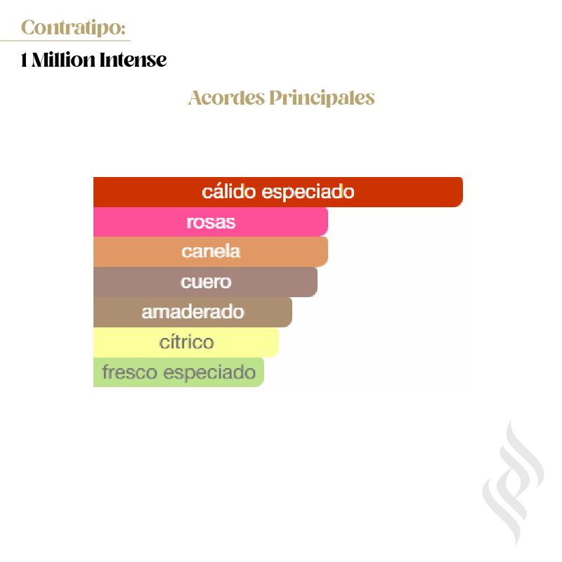 Contratipo (1 Million Intense) es una fragancia de la familia olfativa Amaderada Especiada para Hombres. Se lanzó en 2013. Las Notas de Salida son azafrán, mandarina roja, pimienta negra y cardamomo; las Notas de Corazón son rosa, canela y neroli; las Notas de Fondo son cuero, sándalo, pachulí y raíz de lirio.