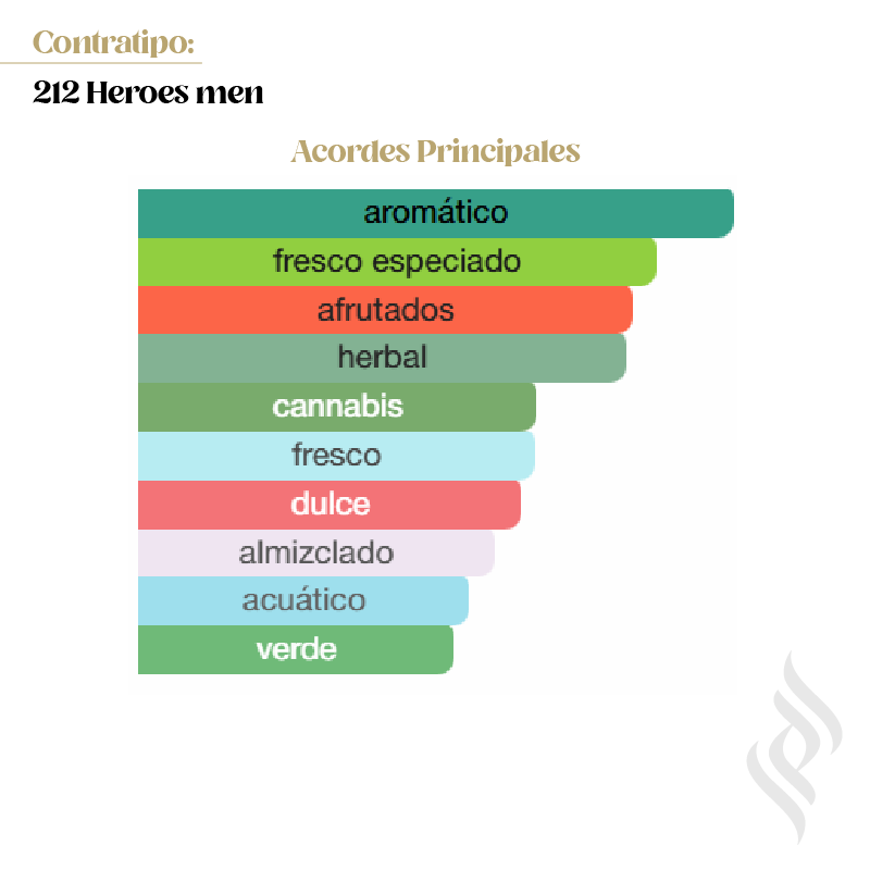 Contratipo (212 Heroes men) es una fragancia de la familia olfativa Aromática Frutal para Hombres. Se lanzó en 2021. Fue creada por Domitille Michalon Bertier, Juliette Karagueuzoglou y Carlos Benaïm. Las Notas de Salida son pera, jengibre y marihuana (cannabis); las Notas de Corazón son geranio y salvia; las Notas de Fondo son almizcle y cuero.