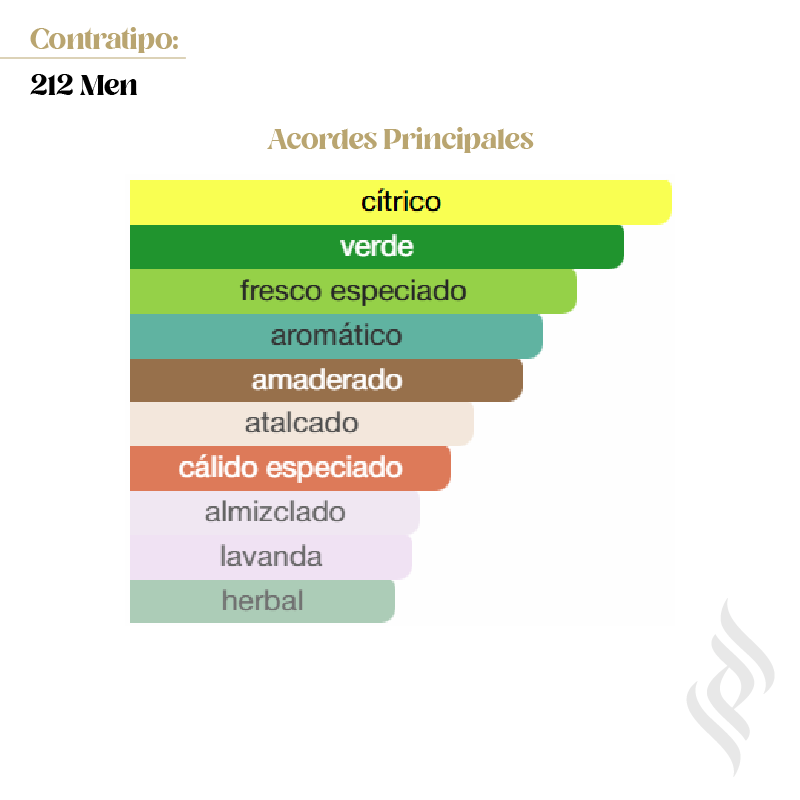 Contratipo (212 Men) es una fragancia de la familia olfativa Almizcle Amaderado Floral para Hombres. Se lanzó en 1999. Fue creada por Alberto Morillas, Rosendo Mateu y Ann Gottlieb. Las Notas de Salida son notas verdes, toronja (pomelo), especias, bergamota, lavanda y petit grain; las Notas de Corazón son jengibre, violeta, gardenia y salvia; las Notas de Fondo son almizcle, sándalo, incienso, vetiver, madera de gaiac y ládano.