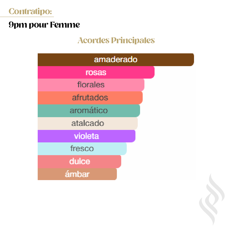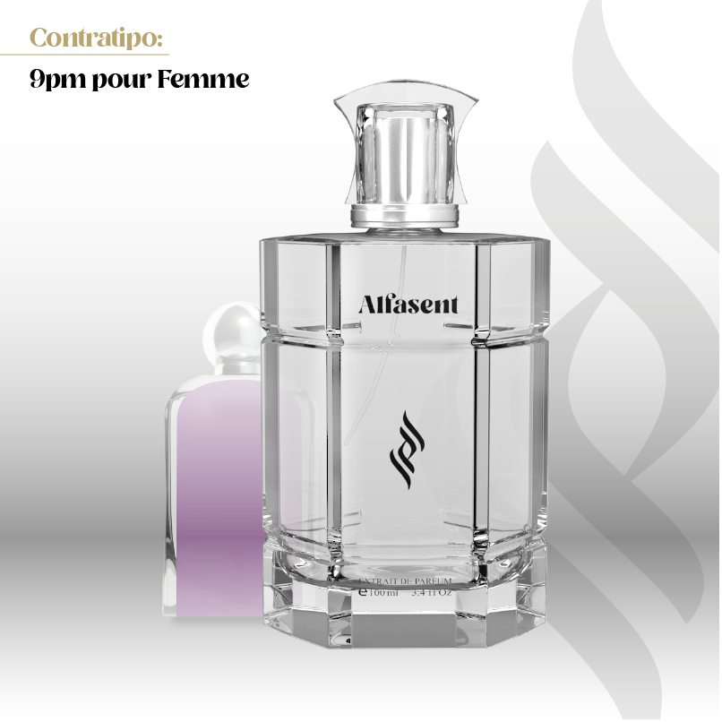 Contratipo (9pm pour Femme) es una fragancia de la familia olfativa Oriental Floral para Mujeres. Se lanzó en 2022. Las Notas de Salida son frambuesa, violeta, manzana y naranja; las Notas de Corazón son rosa, iris, peonía y jazmín; las Notas de Fondo son pino, ciprés, ámbar y cedro.