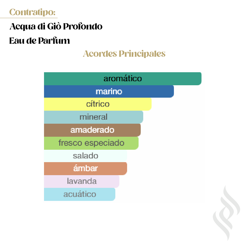 Contratipo (Acqua di Giò Profondo Eau de Parfum) Es una fragancia de la familia olfativa Aromática Acuática para Hombres. Se lanzó en 2024. La Nariz detrás de esta fragancia es Alberto Morillas. Las Notas de Salida son notas marinas y mandarina verde; las Notas de Corazón son romero y lavanda; las Notas de Fondo son Notas minerales, ámbar gris, almizcle, cedro y pachulí.