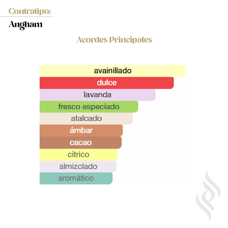 Contratipo (Angham) Es una fragancia de la familia olfativa Oriental Vainilla para Hombres y Mujeres. Esta fragancia es nueva. Se lanzó en 2024. Las Notas de Salida son jengibre, mandarina y pimienta rosa; las Notas de Corazón son lavanda, praliné, cacao y jazmín; las Notas de Fondo son vainilla, ámbar y almizcle.