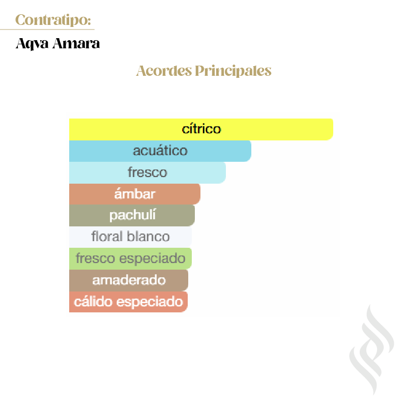 Contratipo (Aqva Amara) Es una fragancia de la familia olfativa Amaderada Acuática para Hombres. Se lanzó en 2014. La Nariz detrás de esta fragancia es Jacques Cavallier Belletrud. La Nota de Salida es mandarina siciliana; las Notas de Corazón son notas acuosas y neroli; las Notas de Fondo son incienso de olíbano (franquincienso) y hojas de pachulí de Indonesia.
