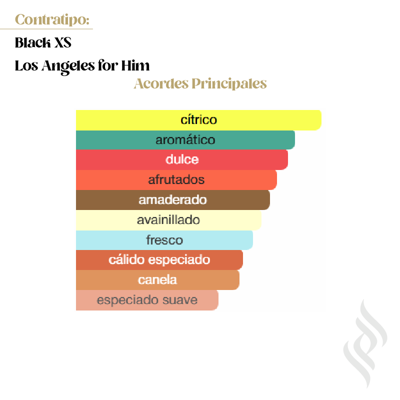 Contratipo (Black XS Los Angeles for Him) es una fragancia de la familia olfativa Oriental Amaderada para Hombres. Se lanzó en 2016. La Nariz detrás de esta fragancia es Olivier Cresp. Las Notas de Salida son naranja, esclarea y limón (lima ácida); las Notas de Corazón son canela, manzana, piña y lirio de los valles (muguete); las Notas de Fondo son notas amaderadas, cumarina, vainilla y musgo de roble.