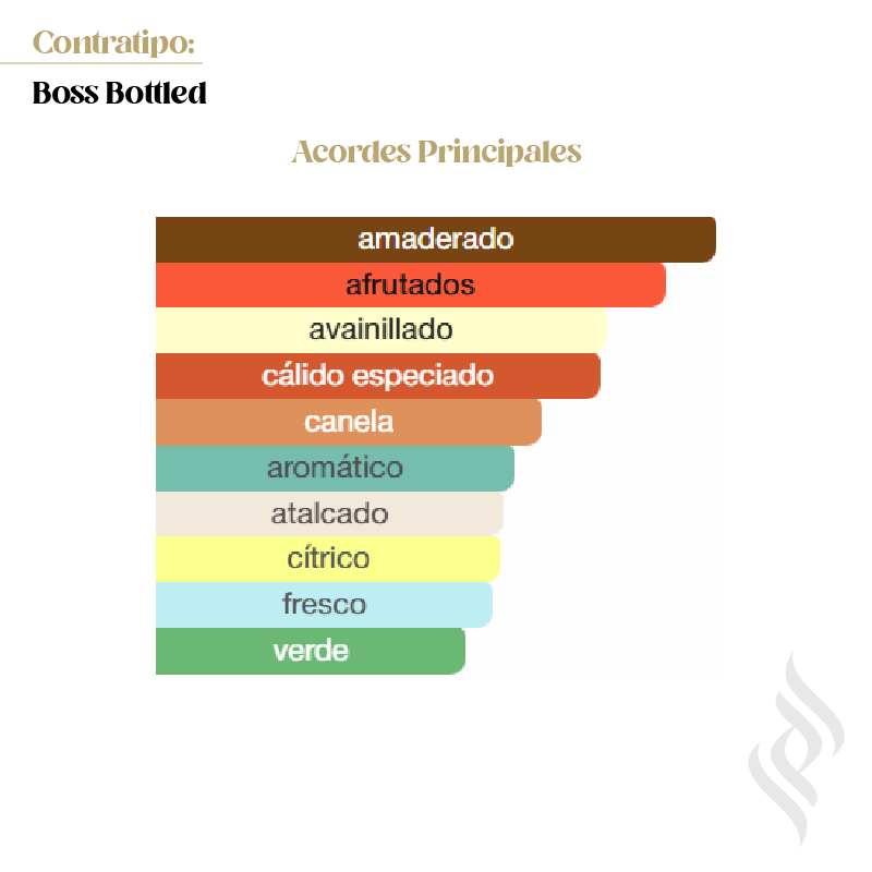 Contratipo (Boss Bottled) es una fragancia de la familia olfativa Amaderada Especiada para Hombres. Se lanzó en 1998. Fue creada por Annick Menardo y Christian Dussoulier. Las Notas de Salida son manzana, ciruela, bergamota, limón (lima ácida), musgo de roble y geranio; las Notas de Corazón son canela, caoba y clavel; las Notas de Fondo son vainilla, sándalo, cedro, vetiver y olivo.