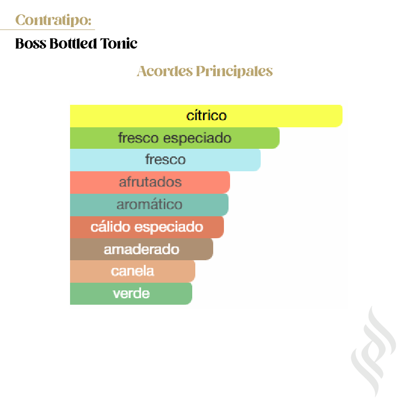 Contratipo (Boss Bottled Tonic) es una fragancia de la familia olfativa Amaderada Especiada para Hombres. Se lanzó en 2017. Las Notas de Salida son manzana, naranja amarga, toronja (pomelo) y limón (lima ácida); las Notas de Corazón son jengibre, canela, geranio y clavos de olor; las Notas de Fondo son notas amaderadas y vetiver.