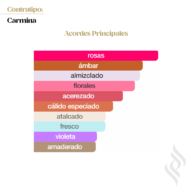Contratipo (Carmina) es una fragancia de la familia olfativa Almizcle Floral Amaderado para Mujeres. Se lanzó en 2023. Las Notas de Salida son Cereza negra, azafrán y pimienta rosa; las Notas de Corazón son rosa de mayo, peonía, violeta y madera de cachemira; las Notas de Fondo son almizcle, ambroxan, mirra y Incienso.