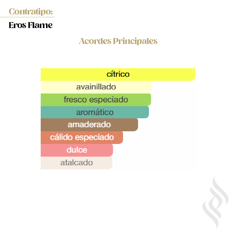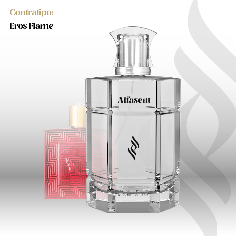 Contratipo (Eros Flame) es una fragancia de la familia olfativa Amaderada Especiada para Hombres. Se lanzó en 2018. La Nariz detrás de esta fragancia es Olivier Pescheux. Las Notas de Salida son mandarina, pimienta de Madagascar, limón (lima ácida), Chinotto y romero; las Notas de Corazón son geranio, rosa y Pepperwood™; las Notas de Fondo son vainilla, haba tonka, sándalo, cedro de Texas, pachulí y musgo de roble.