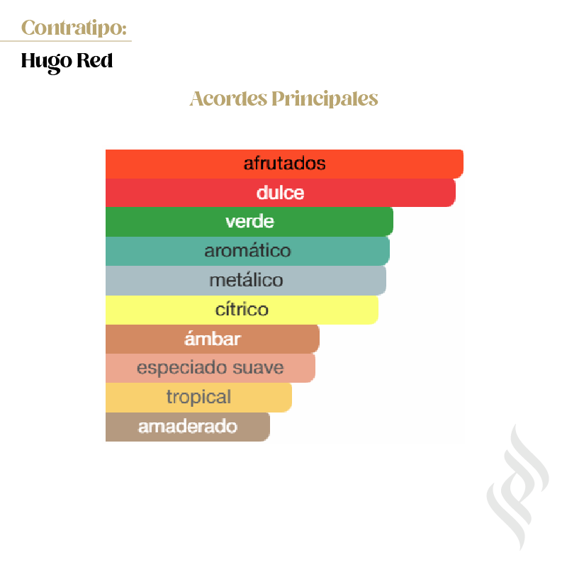 Contratipo (Hugo Red) es una fragancia de la familia olfativa Oriental Especiada para Hombres. Se lanzó en 2013. Las Notas de Salida son notas metálicas, toronja (pomelo), pimienta rosa y gálbano; las Notas de Corazón son ruibarbo, notas metálicas, piña y cedro; las Notas de Fondo son ámbar y haba tonka.