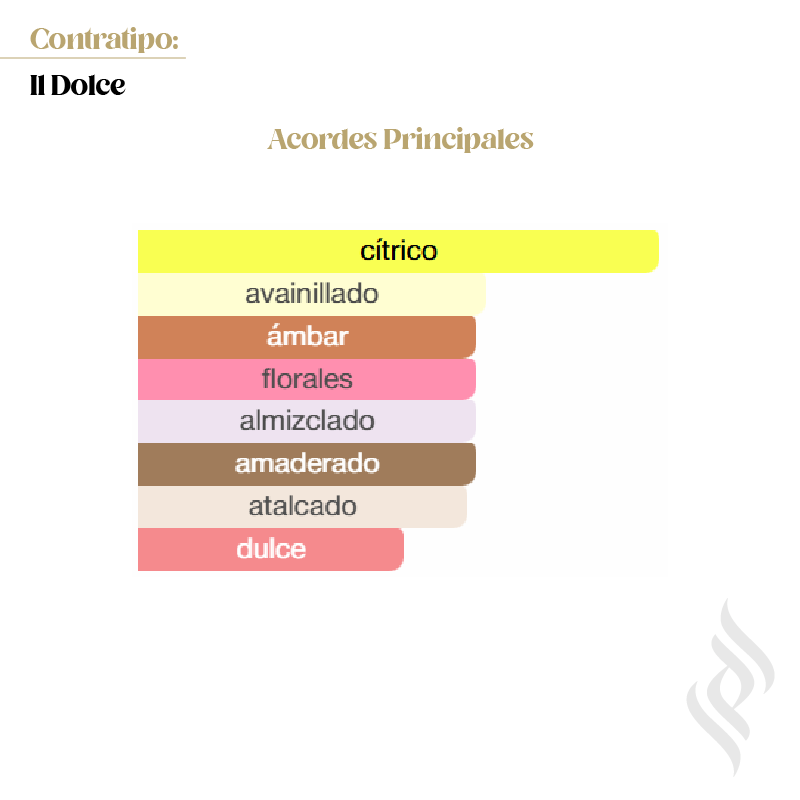 Contratipo (Il Dolce) es una fragancia de la familia olfativa Floral Frutal Gourmand para Hombres y Mujeres. Se lanzó en 2020. Las Notas de Salida son limón (lima ácida) y naranja; las Notas de Corazón son notas florales y ámbar; las Notas de Fondo son notas amaderadas, vainilla y almizcle.