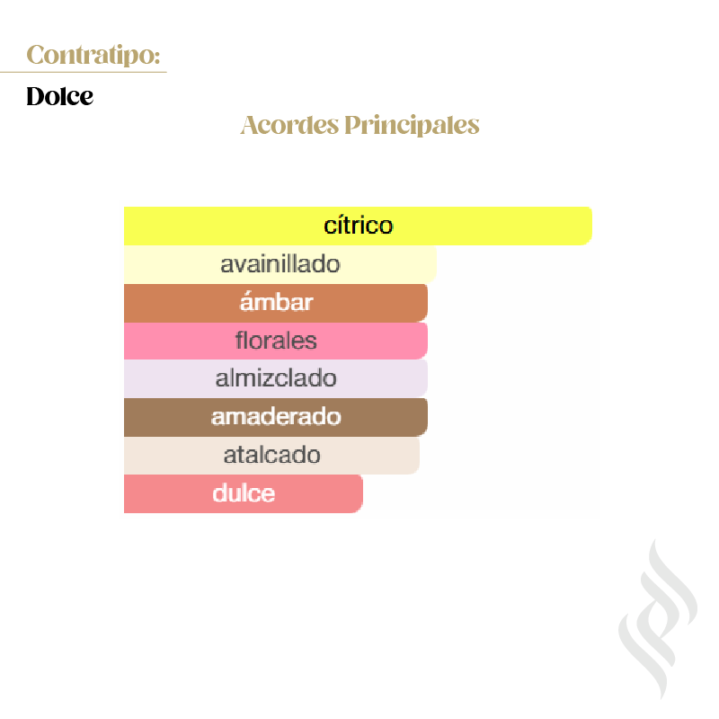 Contratipo (Dolce) es una fragancia de la familia olfativa Floral Frutal Gourmand para Hombres y Mujeres. Se lanzó en 2020. Las Notas de Salida son limón (lima ácida) y naranja; las Notas de Corazón son notas florales y ámbar; las Notas de Fondo son notas amaderadas, vainilla y almizcle.