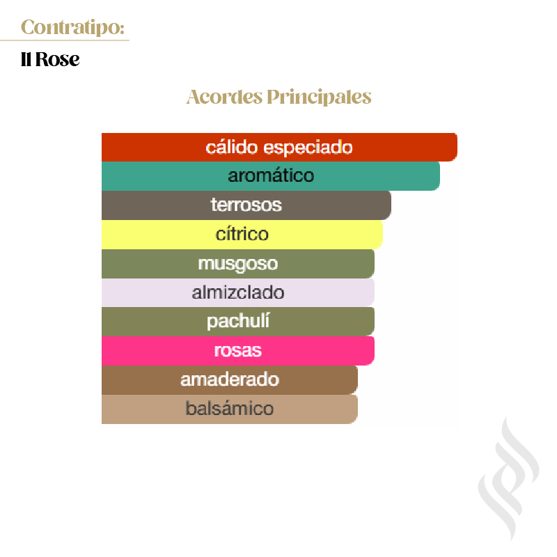 Contratipo (Il Rose) es una fragancia de la familia olfativa Floral Frutal para Mujeres. Se lanzó en 2020. La Nota de Salida es toronja (pomelo); las Notas de Corazón son rosa, cempasúchil (tagete, clavelón) y cardamomo; las Notas de Fondo son pachulí, musgo de roble y almizcle.