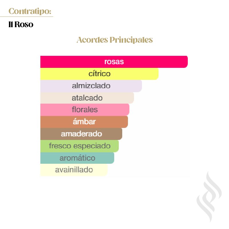 Contratipo (Il Roso) es una fragancia de la familia olfativa Floral Frutal para Mujeres. Se lanzó en 2020. Las Notas de Salida son bergamota, mandarina y ruibarbo; las Notas de Corazón son rosa, jazmín y nuez moscada; las Notas de Fondo son almizcle blanco, cedro, ámbar, incienso, vainilla y vetiver.