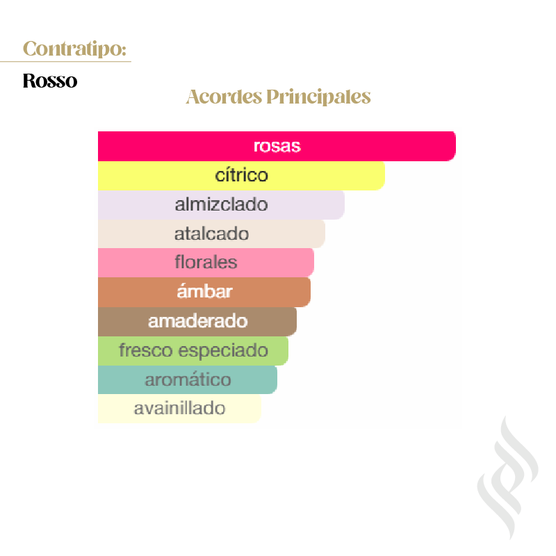 Contratipo (Rosso) es una fragancia de la familia olfativa Floral Frutal para Mujeres. Se lanzó en 2020. Las Notas de Salida son bergamota, mandarina y ruibarbo; las Notas de Corazón son rosa, jazmín y nuez moscada; las Notas de Fondo son almizcle blanco, cedro, ámbar, incienso, vainilla y vetiver.