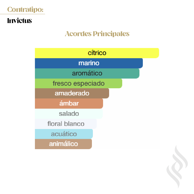 Contratipo (Invictus) es una fragancia de la familia olfativa Amaderada Acuática para Hombres. Se lanzó en 2013. Fue creada por Veronique Nyberg, Anne Flipo, Olivier Polge y Dominique Ropion. Las Notas de Salida son notas marinas, toronja (pomelo) y mandarina; las Notas de Corazón son hoja de laurel y jazmín; las Notas de Fondo son ámbar gris, madera de gaiac, musgo de roble y pachulí.