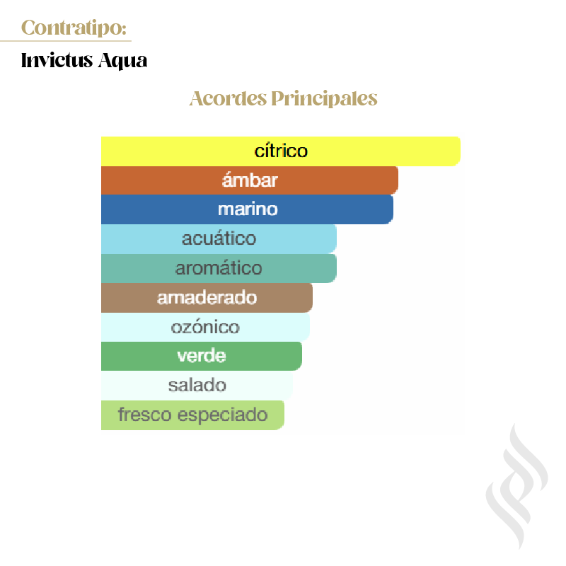 Contratipo (Invictus Aqua) es una fragancia de la familia olfativa Amaderada Acuática para Hombres.Se lanzó en 2016. Las Notas de Salida son yuzu, toronja (pomelo) y pimienta rosa; las Notas de Corazón son agua de mar y hojas de violeta; las Notas de Fondo son ámbar gris, Amberwood y madera de gaiac.