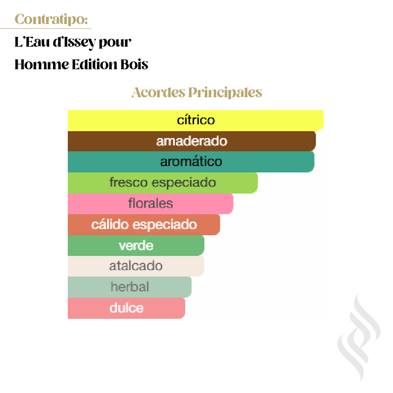 Contratipo (L’Eau d’Issey pour Homme Edition Bois) Es una fragancia de la familia olfativa Amaderada Acuática para Hombres. Se lanzó en 2010. La Nariz detrás de esta fragancia es Jacques Cavallier Belletrud. Las Notas de Salida son yuzu, ciprés, cedrón (hierba luisa, verbena de olor), bergamota, limón (lima ácida), salvia, mandarina, cilantro y estragón; las Notas de Corazón son flor de loto azul, nuez moscada, azafrán, canela de Ceylan, lirio de los valles (muguete), reseda (miñoneta) y geranio bourbon; las Notas de Fondo son vetiver de Tahití, cedro, sándalo y almizcle.