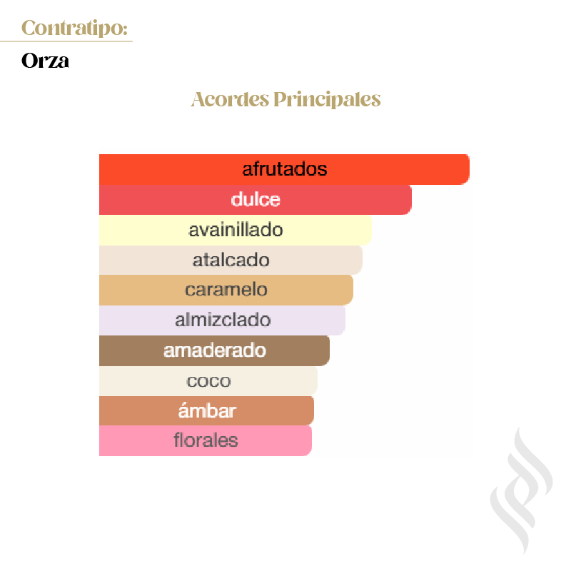 Contratipo (Orza) Es una fragancia de la familia olfativa Floral Frutal para Hombres y Mujeres. Se lanzó en 2020. La Nariz detrás de esta fragancia es Paolo Terenzi. Las Notas de Salida son bayas silvestres, coco, manzana verde, ciruela, orquídea, mandarina y magnolia; las Notas de Corazón son jazmín, rosa de Bulgaria (rosa Damascena de Bulgaria) y lirio de los valles (muguete); las Notas de Fondo son caramelo, almizcle, vainilla de Madagascar, benjuí, ámbar y sándalo.