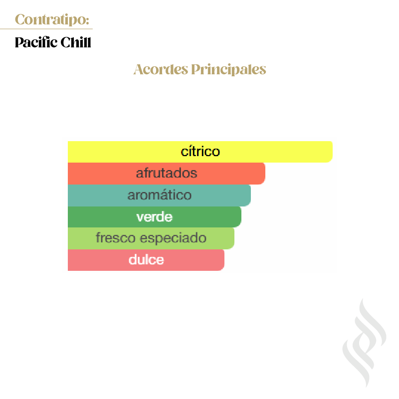 Contratipo (Pacific Chill) Es una fragancia de la familia olfativa Aromática Frutal para Hombres y Mujeres. Se lanzó en 2023. La Nariz detrás de esta fragancia es Jacques Cavallier Belletrud. Las Notas de Salida son cidra, menta, naranja, limón (lima ácida), grosellas negras y cilantro; las Notas de Corazón son chabacano, albahaca, semillas de zanahoria y rosa de mayo; las Notas de Fondo son higo, dátiles y almizcle ambreta.