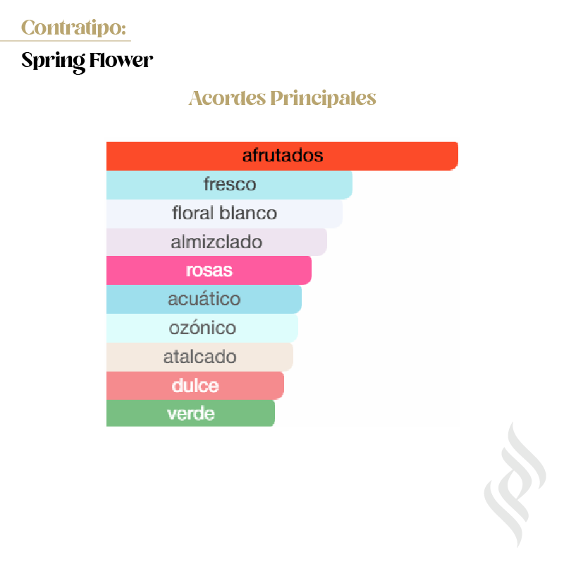 Contratipo (Spring Flower) es una fragancia de la familia olfativa Floral Frutal para Mujeres. Se lanzó en 1996. Fue creada por Olivier Creed y Pierre Bourdon. Las Notas de Salida son manzana, melón y durazno (melocotón); las Notas de Corazón son jazmín y rosa; las Notas de Fondo son almizcle y ámbar gris.