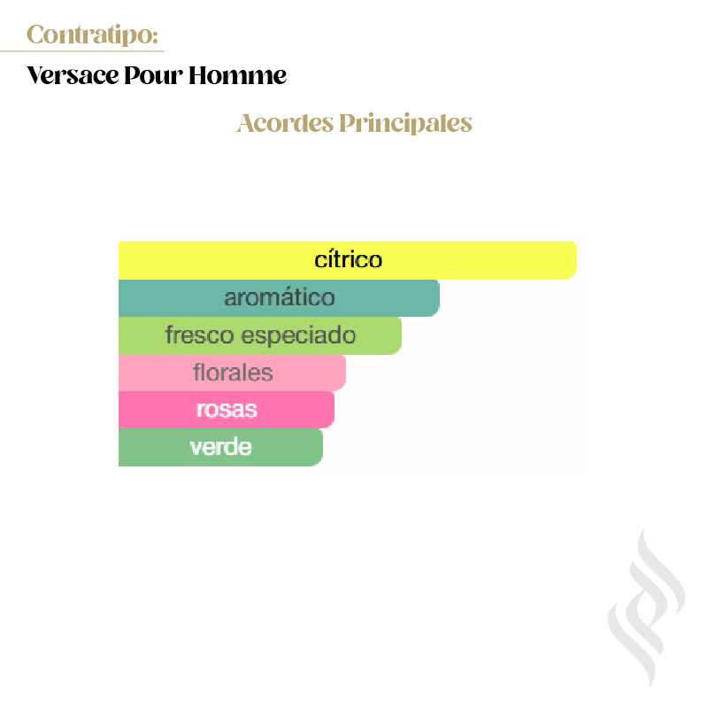 Contratipo (Versace Pour Homme) es una fragancia de la familia olfativa Aromática Fougère para Hombres. Se lanzó en 2008. La Nariz detrás de esta fragancia es Alberto Morillas. Las Notas de Salida son limón (lima ácida), bergamota, neroli y rosa de Mai; las Notas de Corazón son jacinto, cedro, esclarea y geranio; las Notas de Fondo son haba tonka, almizcle y ámbar.