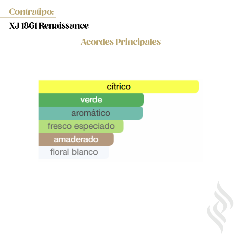 Contratipo (XJ 1861 Renaissance) es una fragancia de la familia olfativa Cítrica Aromática para Hombres y Mujeres. Se lanzó en 2011. Las Notas de Salida son limón de Amalfi (lima de Amalfi), naranja tangerina, bergamota y petit grain; las Notas de Corazón son menta, lirio de los valles (muguete) y rosa; las Notas de Fondo son almizcle, cedro de Virginia, pachulí y ámbar.