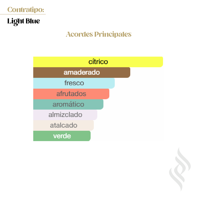 Contratipo (Light Blue pour Homme) es una fragancia de la familia olfativa Cítrica Aromática para Hombres. Se lanzó en 2007. Las Notas de Salida son toronja (pomelo), bergamota, mandarina siciliana y enebro de Virginia; las Notas de Corazón son pimienta, romero y palo de rosa de Brasil; las Notas de Fondo son almizcle, incienso y musgo de roble. Este perfume es el ganador del premio FiFi Award Fragrance Of The Year Men`s Luxe 2008.